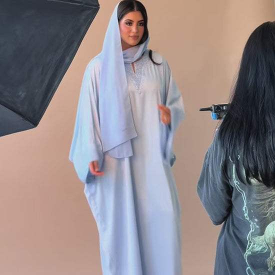 Delicate hand-embellished beadwork trims the neckline and wide sleeves featuring fine glass beads that shimmer softly. Elegant and refined, this kaftan is perfect for special occasions or any moment that calls for quiet luxury.