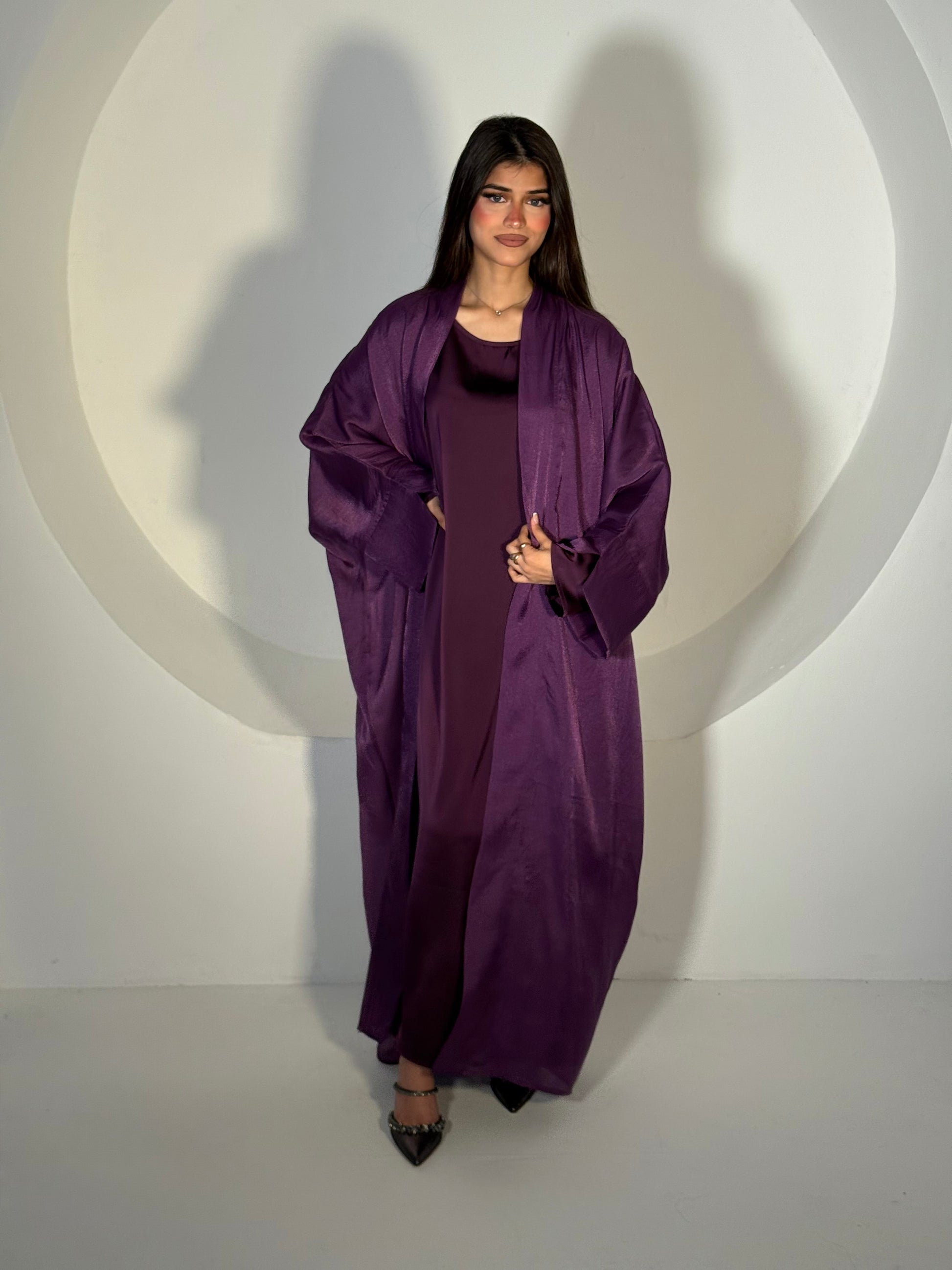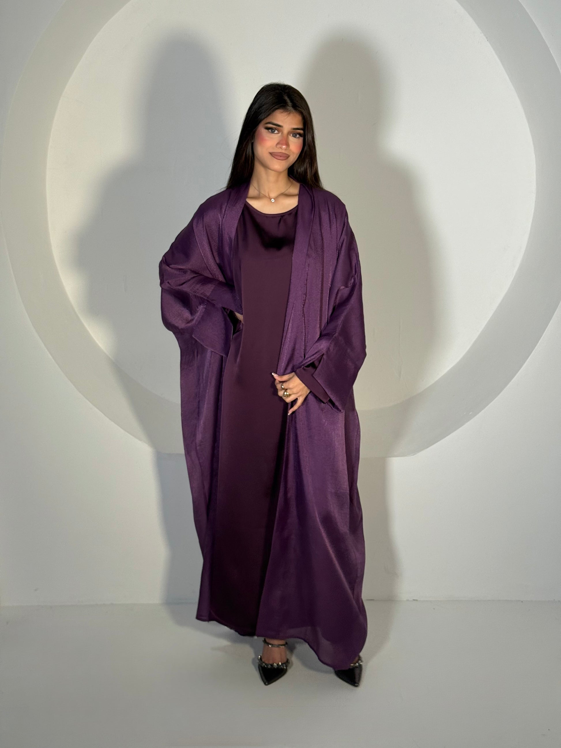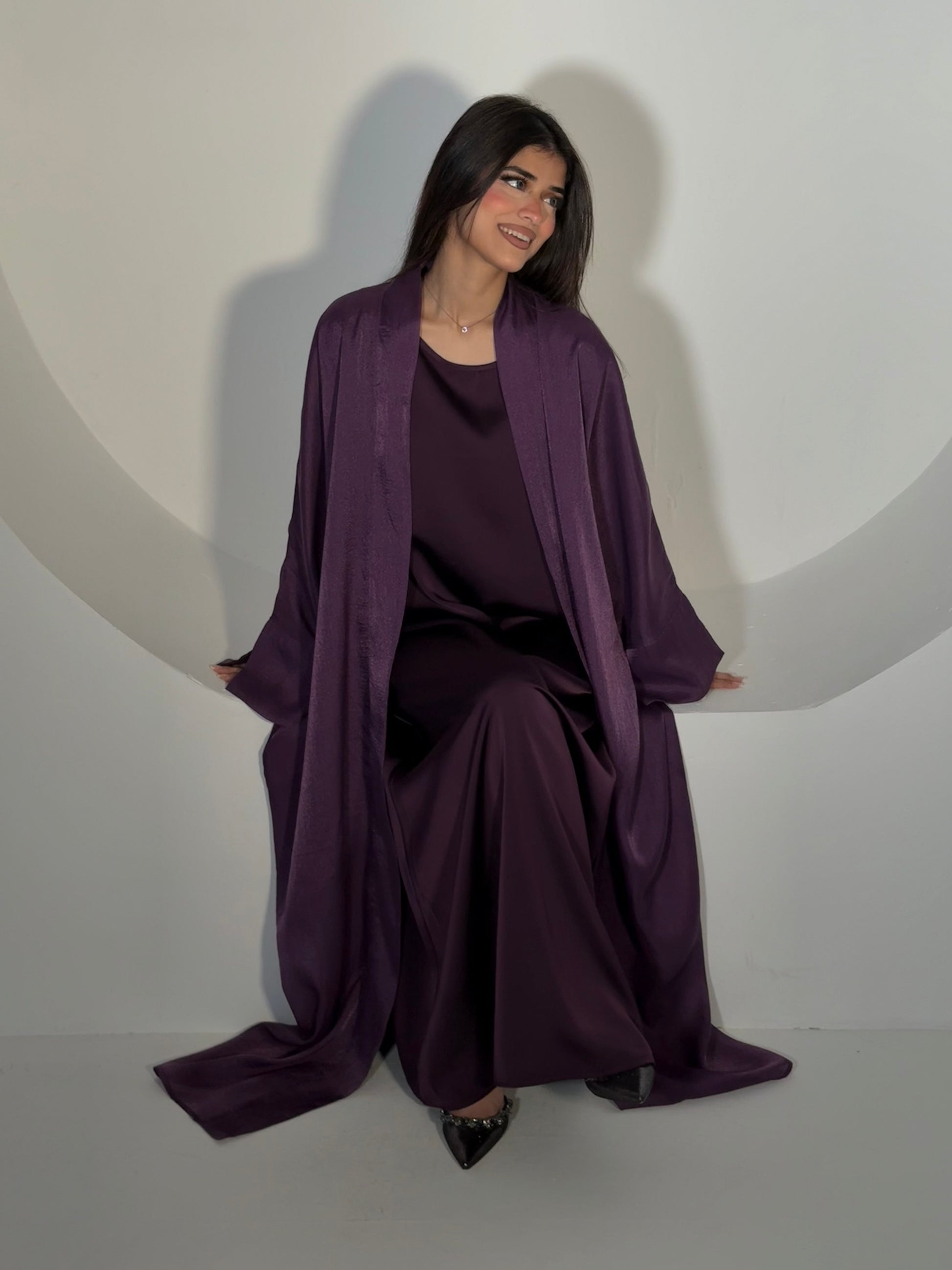 A timeless 3-piece abaya set crafted from a silky, non-cling underslip, a soft breathable chiffon hijab, and a lightweight glossy outer abaya with a smooth flowy drape all in a rich, deep purple shade that adds effortless elegance to any look. Perfect for everyday or occasion wear.