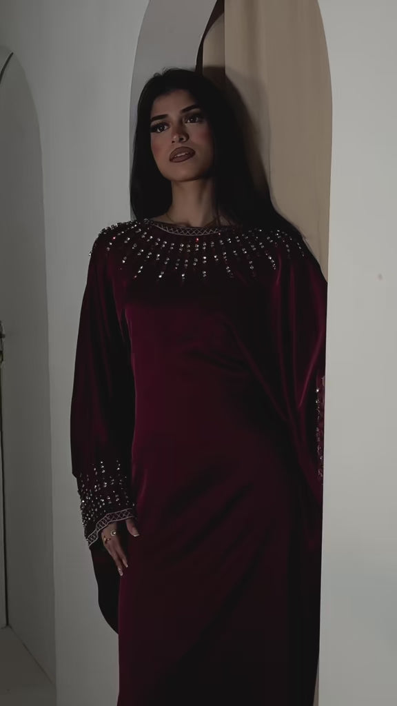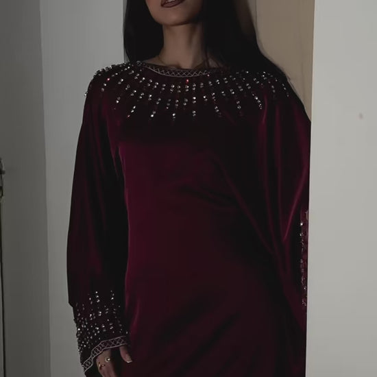 A rich deep-red satin kaftan with full coverage and a smooth luxurious drape. It features an inner belt for a flattering fit and is finished with silver and maroon stone detailing along the neckline and sleeves, adding the perfect touch of sparkle